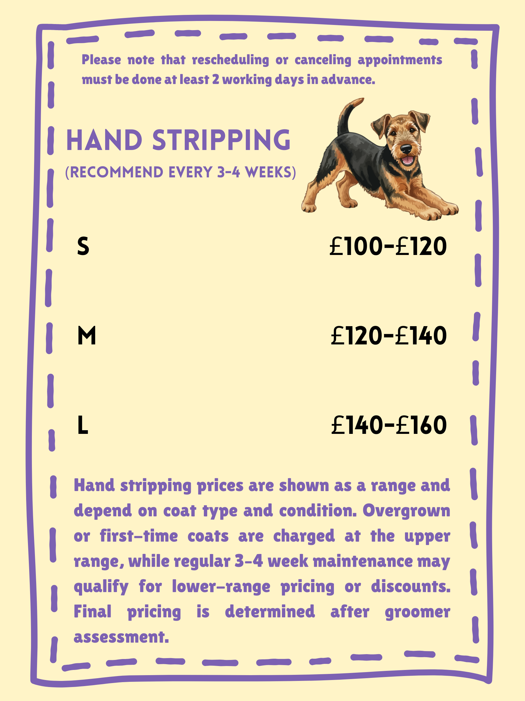 Handstripping is a delicate process that takes longer than regular grooming. If you are unsure whether your dog could benefit from Hand Stripping, you can of course always ask one of our groomers.