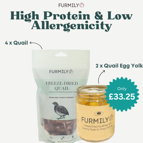 This bundle combines freeze-dried whole quail and freeze-dried quail egg yolk, both naturally rich in high-quality protein and gentle on digestion. Using single-source ingredients and a minimal processing method, each product retains its natural nutrients, flavour, and aroma — without unnecessary additives.
